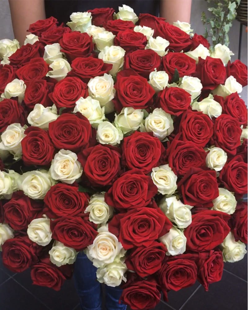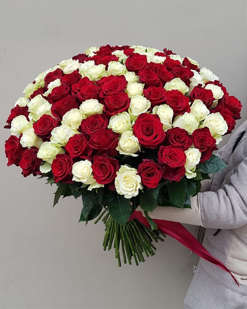 Elegants ziedu sveiciens, ziedu pušķis no 101 vienas rozes, baltu un sarkanu rožu mix, ziedu garumu varat izvēlēties sākot no 40 cm.