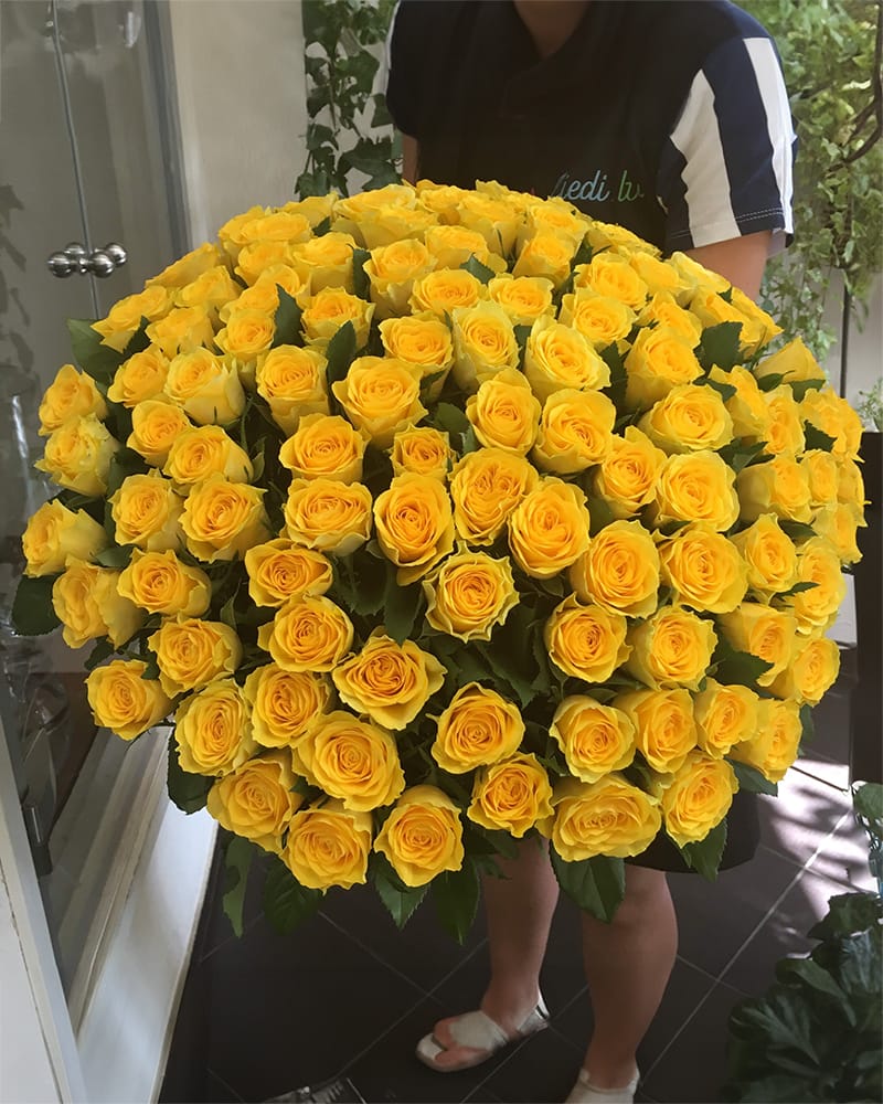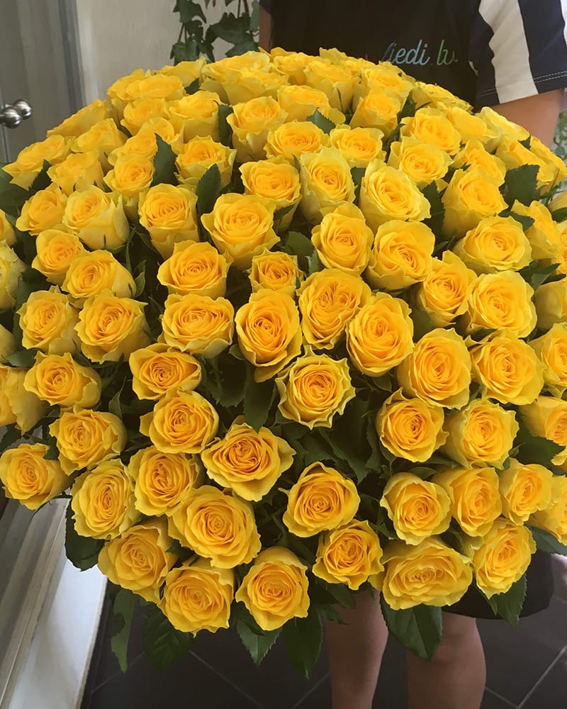 Elegants pušķis no 101 dzeltenas rozes. Iespējams izvēlēties ziedu garumu.