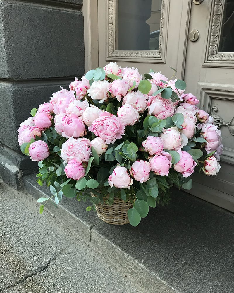 Izcili krāšņs un liels peoniju grozs ar eikalipta zariem.