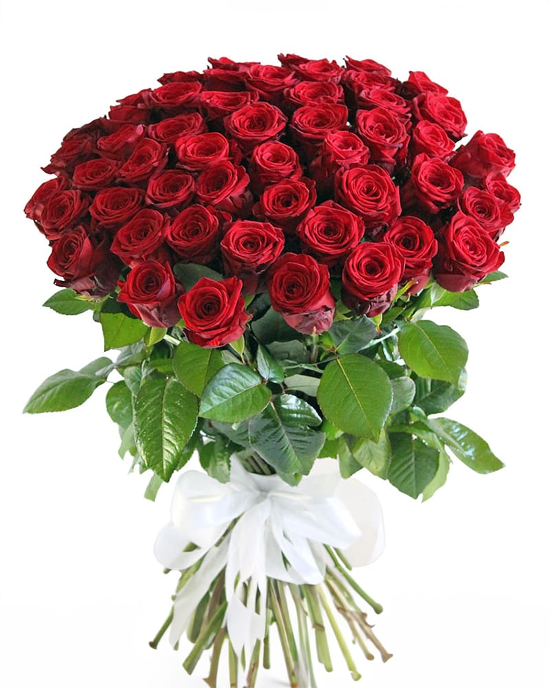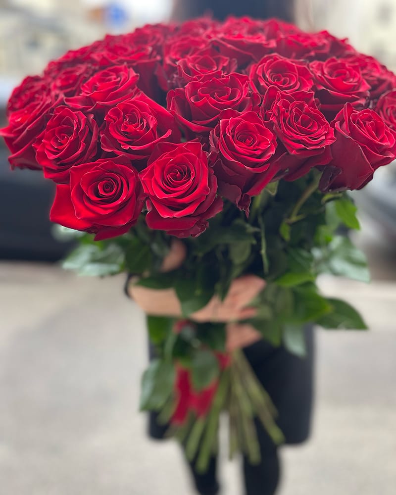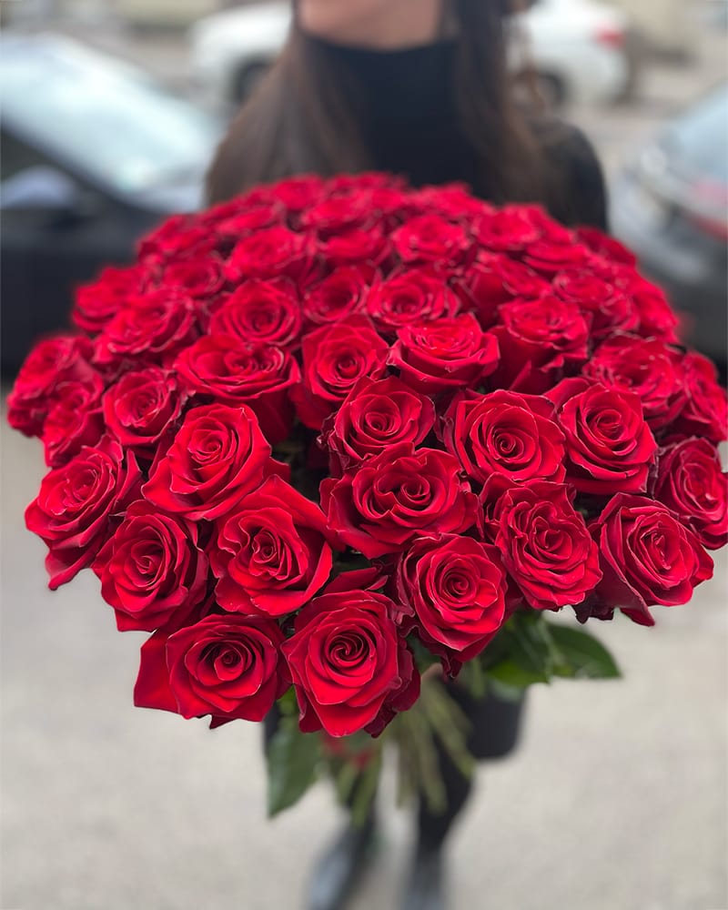 Ekskluzīvs, augstākās kvalitātes, garu, sarkanu rožu pušķis. Pušķī 51 roze, ziedu garums 70-80 cm.
