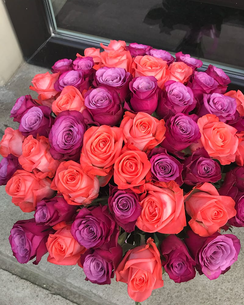 Rožu pušķis no 51 laša krāsas un violetām rozēm. Pušķis veidots klasiskā puslodē. Puššķī iespējams mainīt ziedu skaitu.