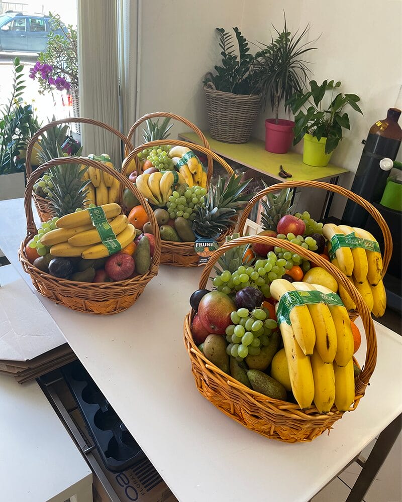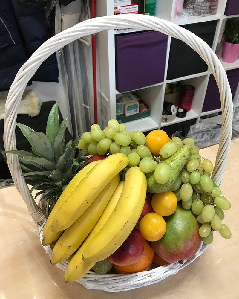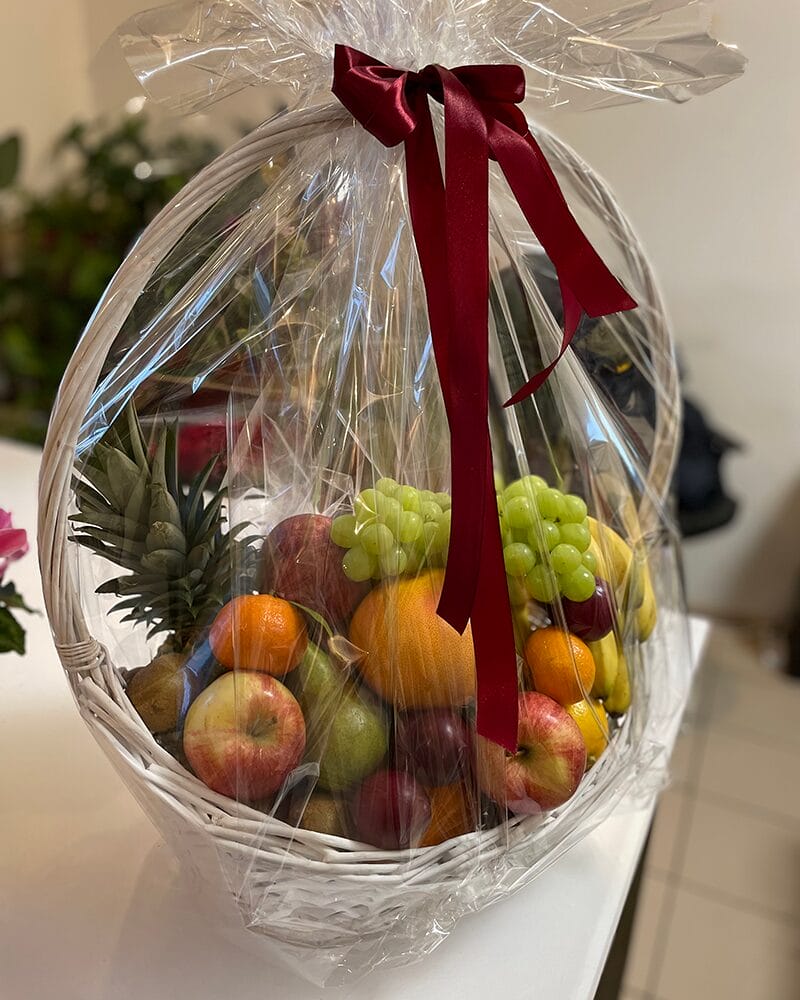 Augļu groza sastāvs – ananāss, dažādi citrusaugļi, kivi, mango, vīnogas un citi. Grozā ir aptuveni 5 kg. dažādu augļu, groza saturs un forma var būt atšķirīga no attēlā redzamā.