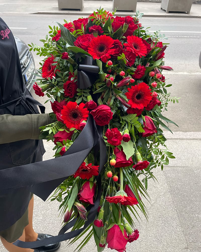 Bēru štrauss veidots no sarkanām rozēm, gerberām un zaļumiem. Izmērs ~60x30cm.