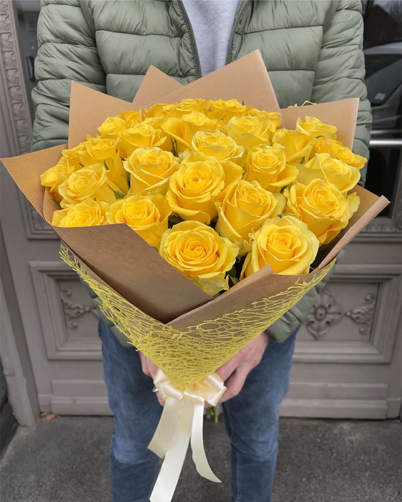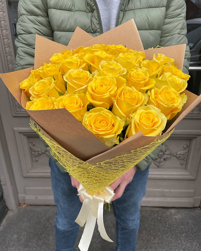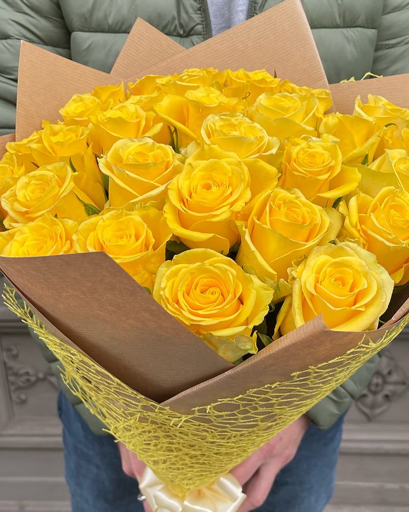 Dzeltenu 50 cm garu rožu pušķis dekoratīvā papīrā. Pušķī iespējams mainīt ziedu skaitu sākot no 25 rozēm. Izvēlieties nepieciešamo rožu skaitu, mēs izveidosim pušķi un piegādāsim izvēlētajam adresātam.