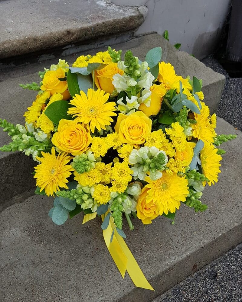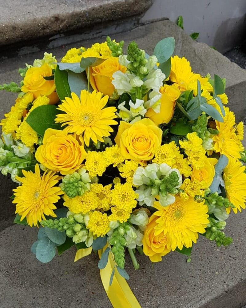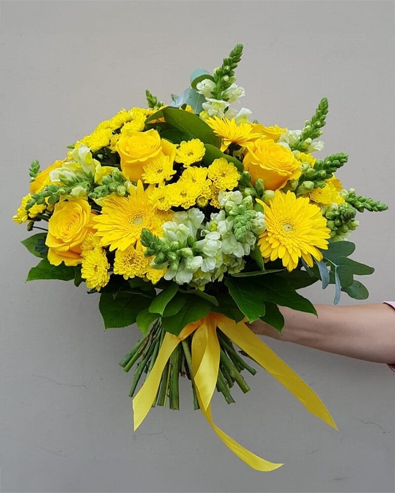 Ziedu pušķis, kura sastāvā dominē dzeltenas krāsas ziedi- gerberas, krizantēmas, rozes. Attēlā redzams standarta izmēra pušķis.