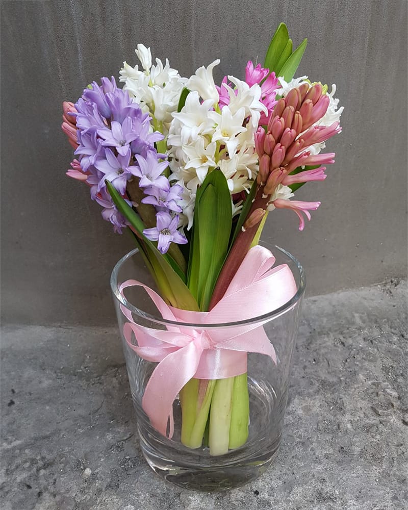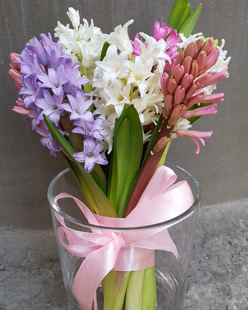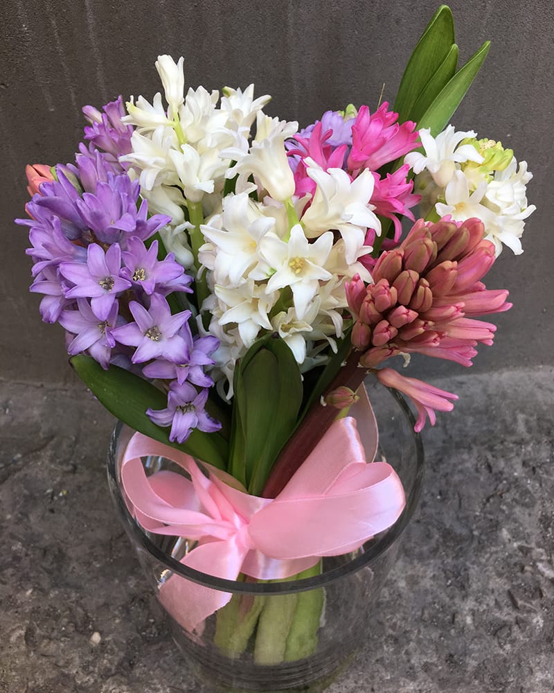 Burvīgi smaržojošs, dažādu krāsu Hiacinšu pušķis, pušķī 11 Hiacintes.