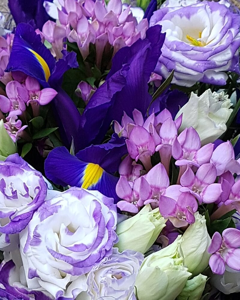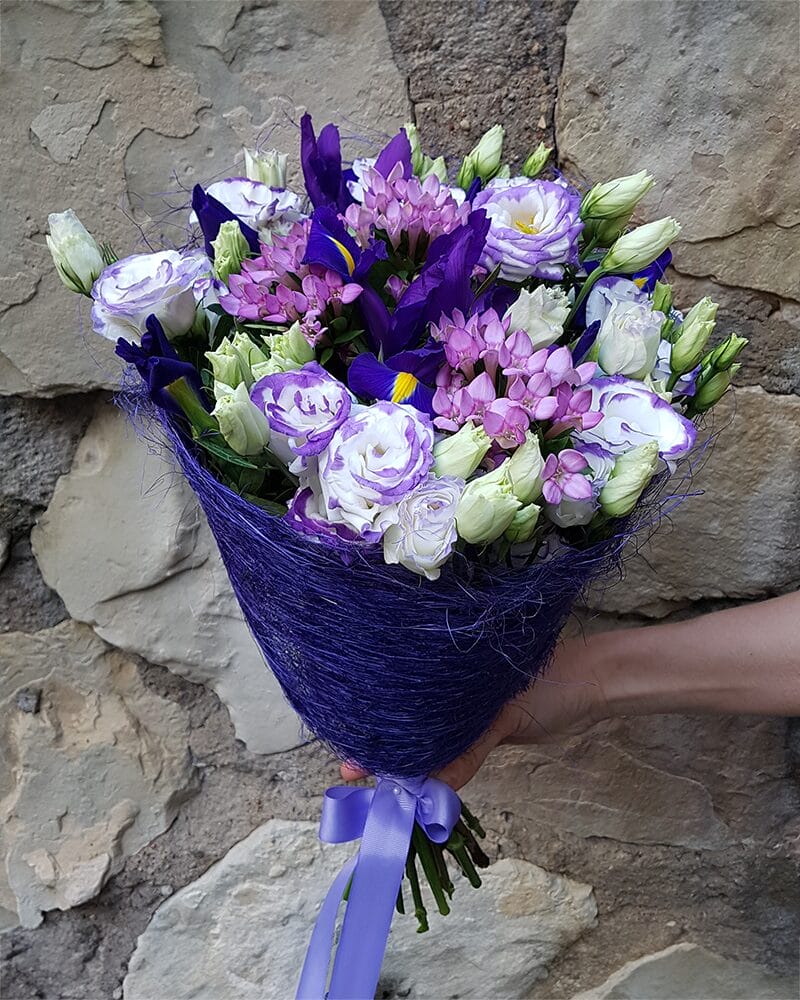 Ziedu pušķis no lizantēm, īrisiem un zaļumiem, noformēts dekoratīvā iepakojumā. Pušķa sastāvs un izskats var nedaudz mainīties atbilstoši ziedu sezonai un to pieejamībai. Ziedu pusķis ir mūsu darbinieku veidots un fotogrāfēts bez filtriem un apstrādes. Attēlam ir ilustratīva nozīme.