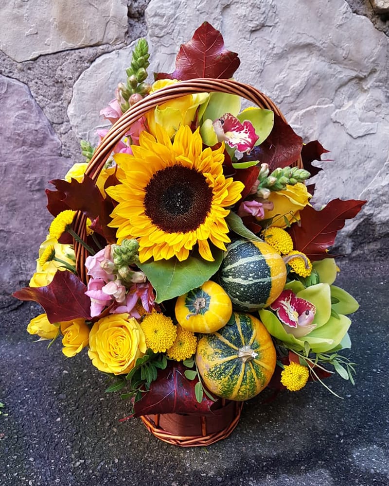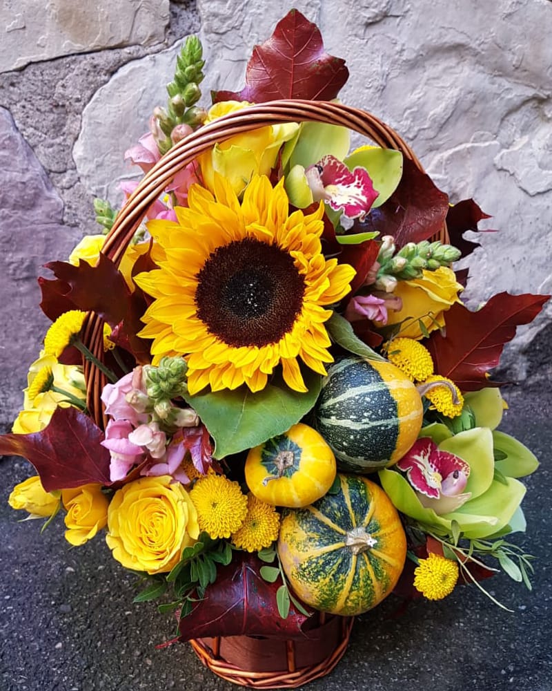 Rudens ziedu grozs ar mini ķirbjiem, saulespuķi, sīkziedu krizantēmām, cimbīdijām un rozēm. Kompozīcijas augstums ~30 cm.