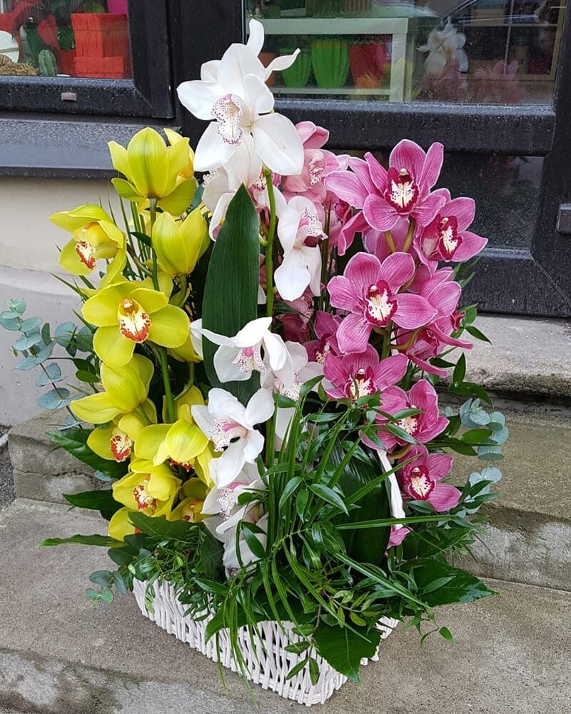 Orhideju grozs. Grozā 5gb. 60cm garas dažadu krāsu orhidejas un dažādi zaļumi. Uz katra orhideju kāta ~11 orhideju ziedi. Ziedu groza augstums aptuveni 60-70cm, diametrs 50-60 cm. Orhidejas ir vienas no izturīgākajiem ziediem, kompozīcija saglabāsies nevainojamā izskatā vairākas nedēļas.