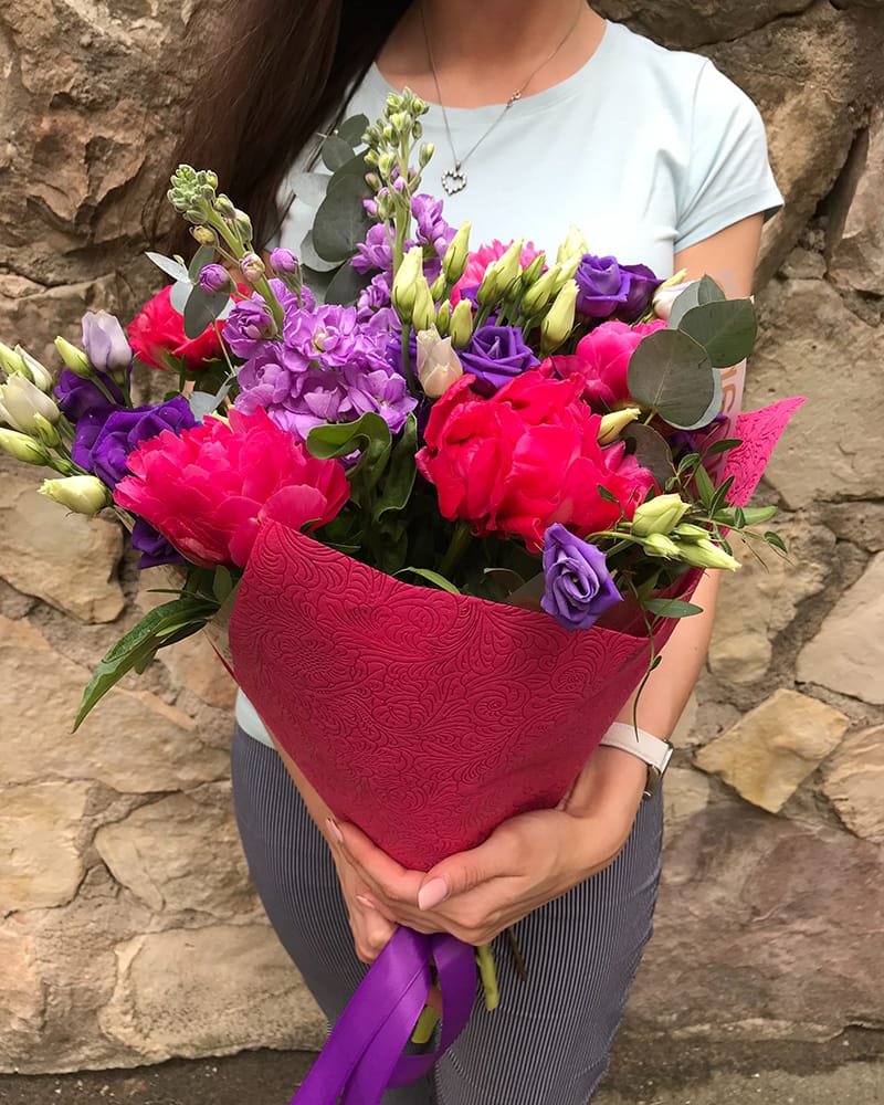 Burvīgs smaržojošu vasaras ziedu pušķis, krāšņās peonijas, smaržīgās lefkojas un skaistās lizantes, kā arī eksotiskie eikalipta zari, tas viss noformēts dekoratīvā iesaiņojumā.