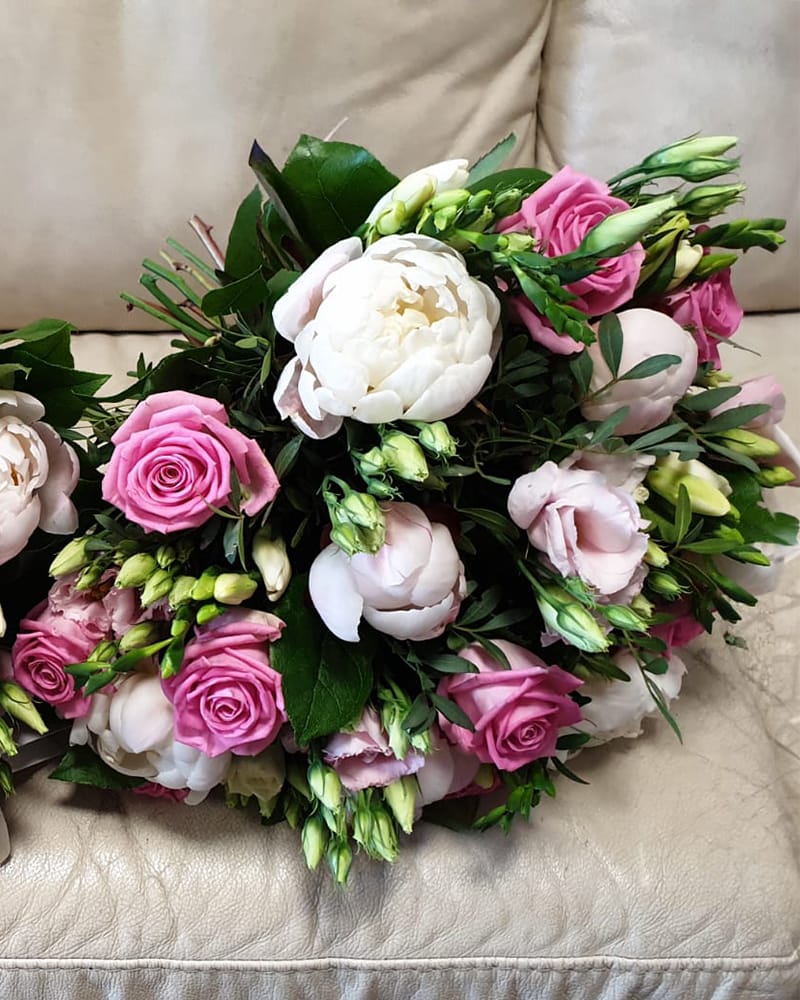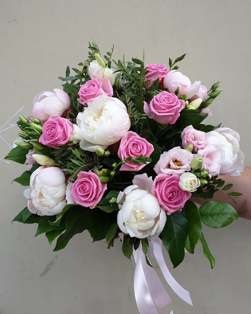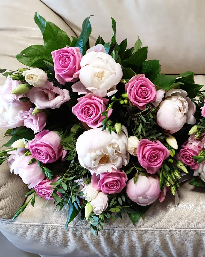 Burvīgs vasaras ziedu pušķis – peonijas, rozes, lizantes, frēzijas.
