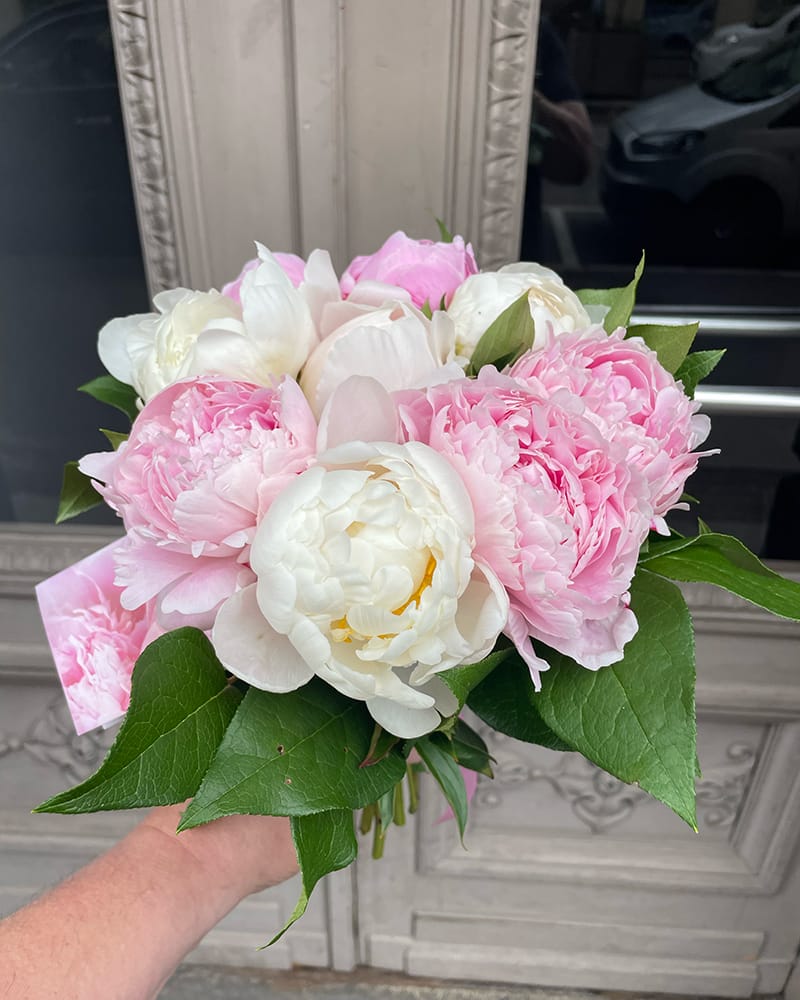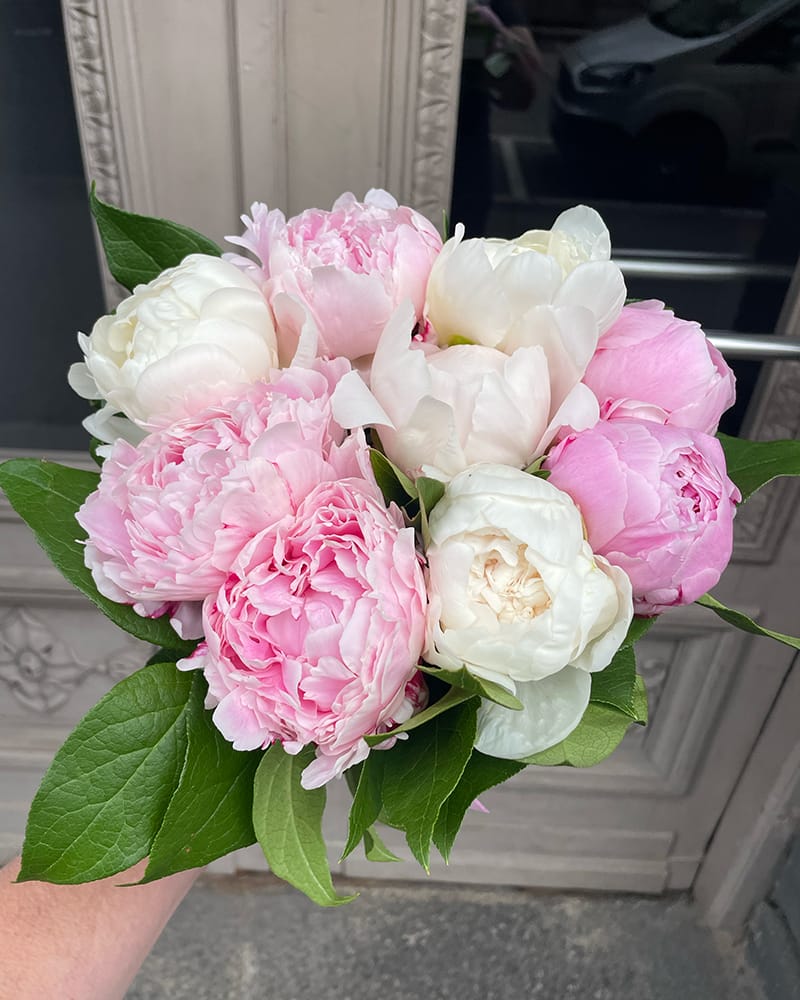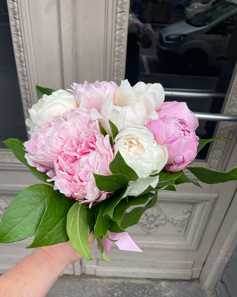 Burvīgi smaržojoš peoniju pušķis no 9 baltām un rozā peonijām.