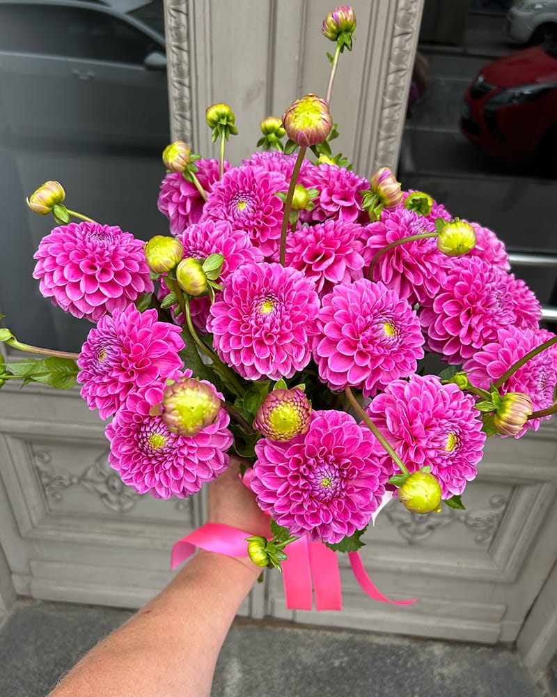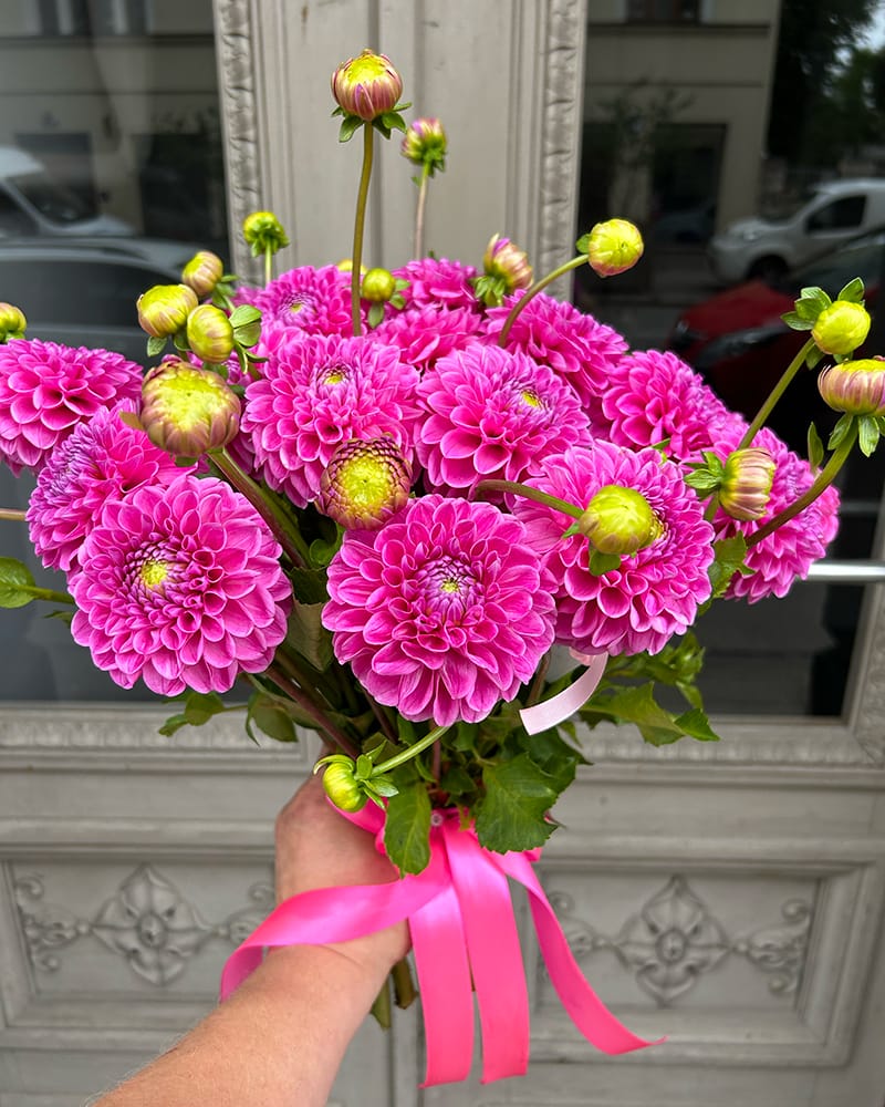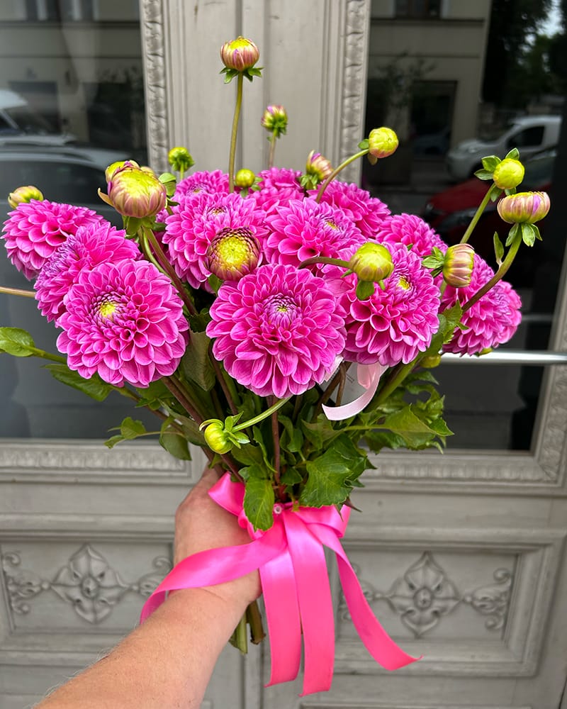 Skaists rozā dāliju pušķis, pušķis veidots no 21 dālijas, apsiets ar satīna lentu.