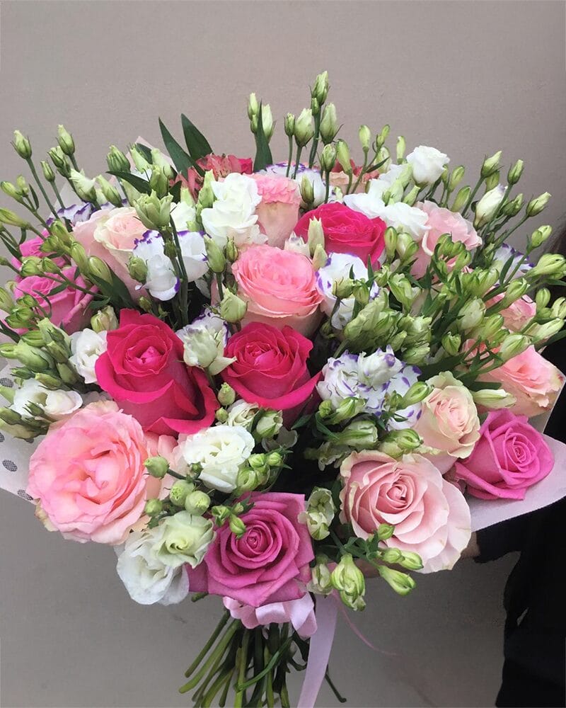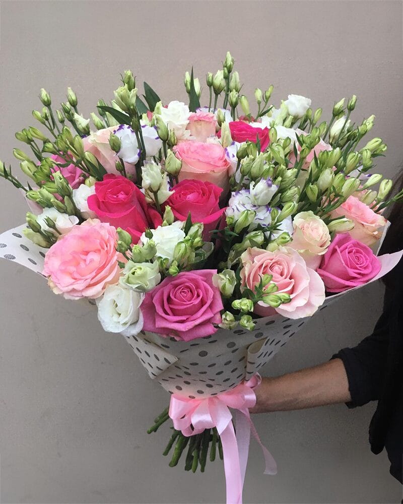 Rozā rožu un baltu lizanšu pušķis