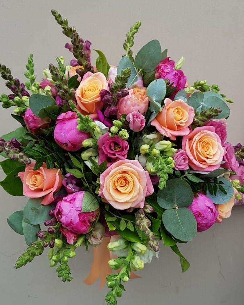Ziedu pušķis rozā toņos, kuru sastāvā ir rozes, peonijas, lauvmutītes, lizantes un zaļumi. Attēlā redzams standarta izmēra pušķis.