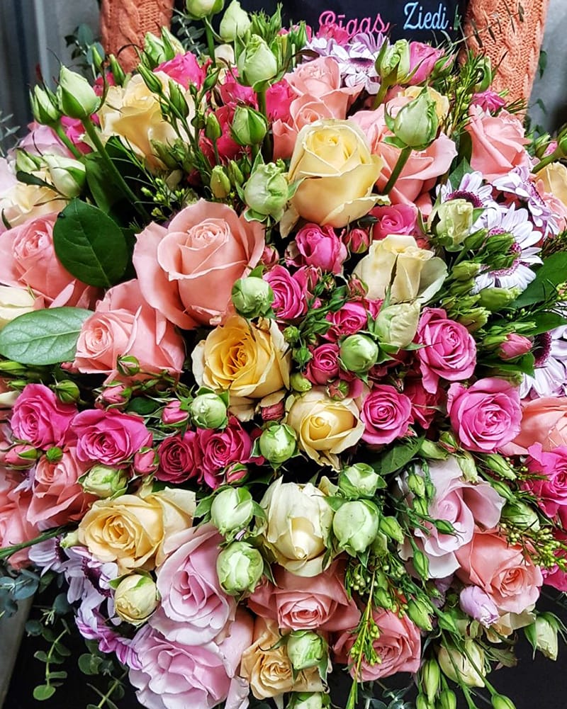 Ziedu pušķis sastāv no rozēm, krūmrozēm, krizantēmām, lizantēm, eikalipta un citiem zaļumiem