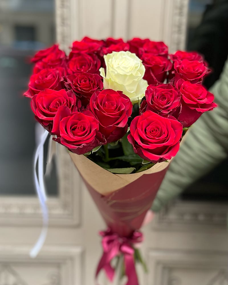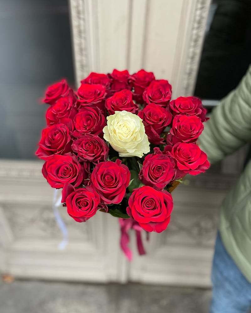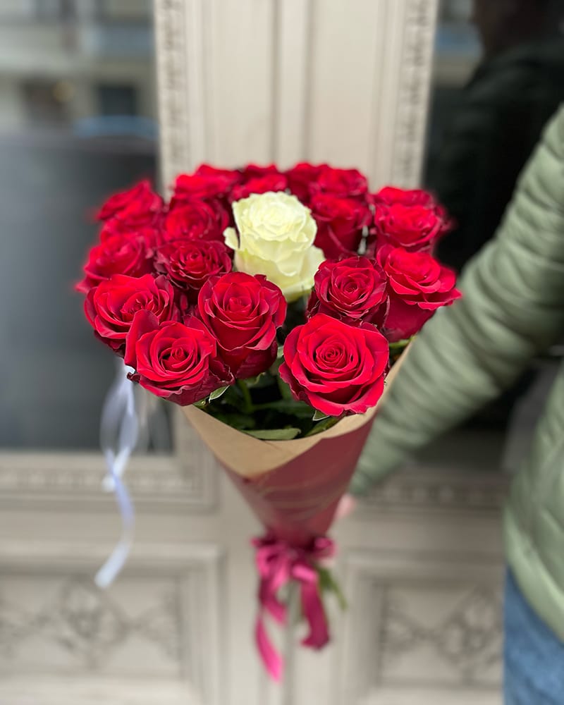 Rozū puškis sarkanas rozes ar vienu baltu rozi