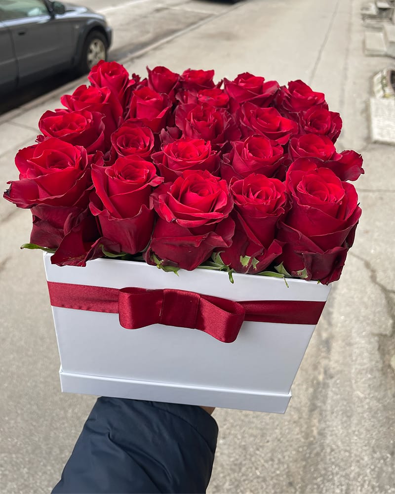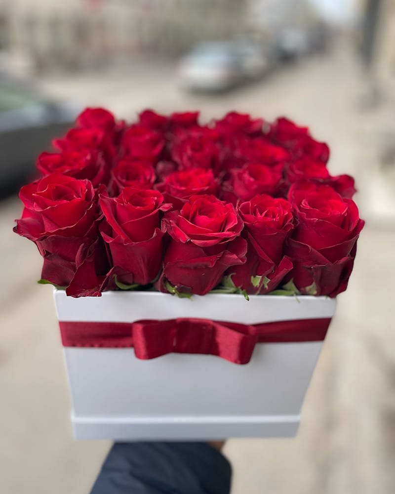 Eleganta dāvana, 21 sarkanas rozes kastē.