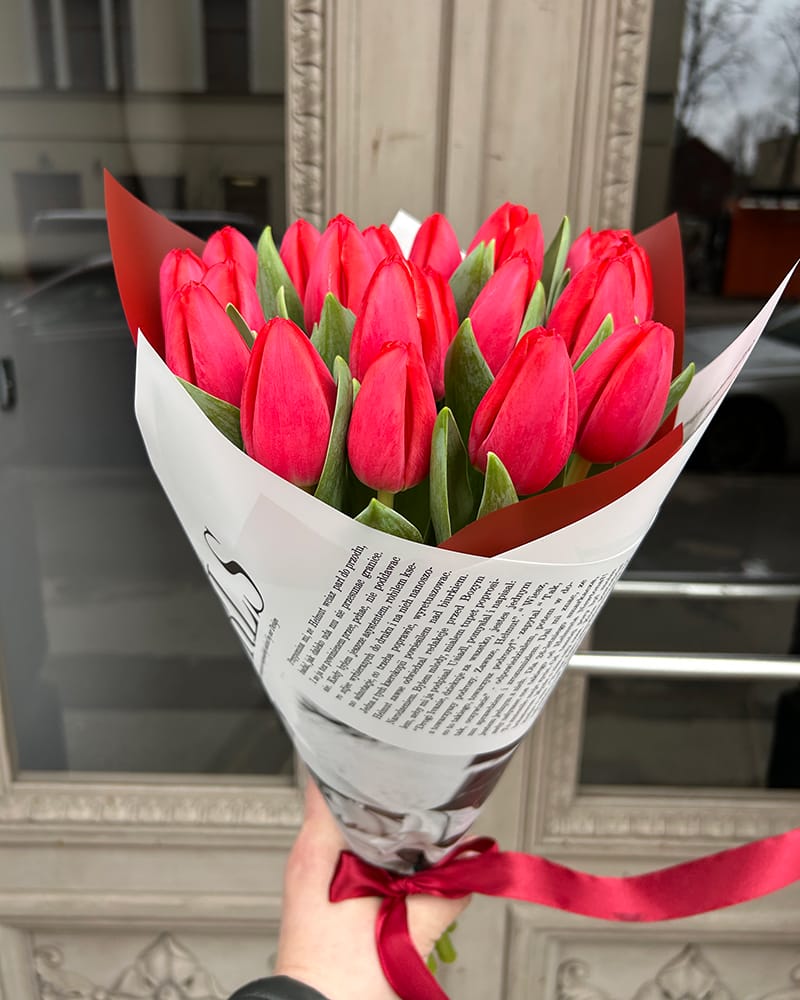 Sarkanas tulpes. Pušķa sastāvs 21 sarkana tulpe, dekoratīvais iepakojums, satīna lenta. Ziedu skaitu var mainīt pievienojot pušķim papildus ziedus.