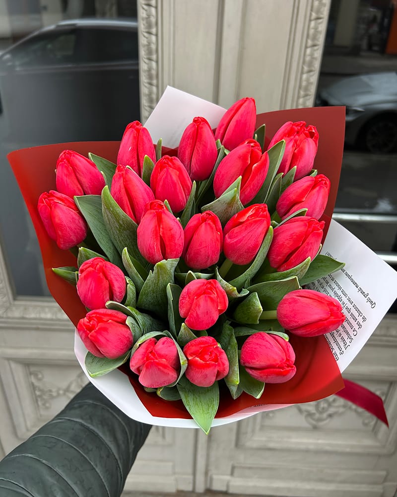 Sarkanas tulpes – 21 svaigs zieds elegantā pušķī