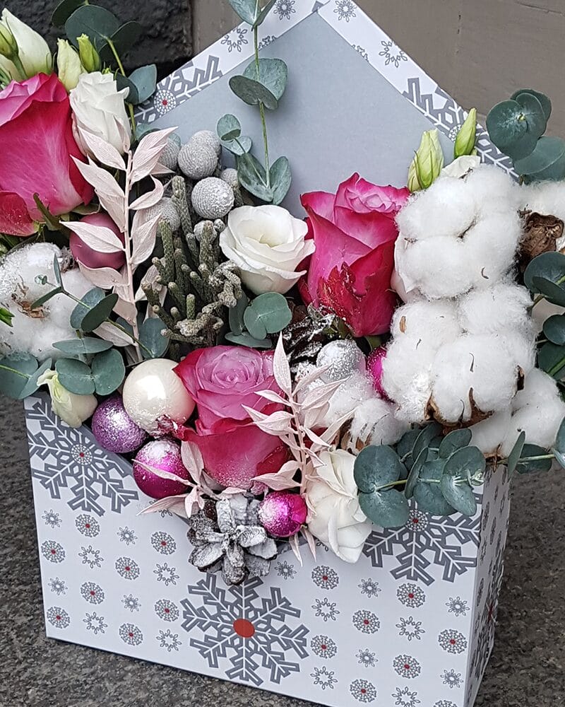 Ziemassvētku kompozīcija ar rozēm, lizantēm, zaļumiem, kokvilnu un rotājumiem.