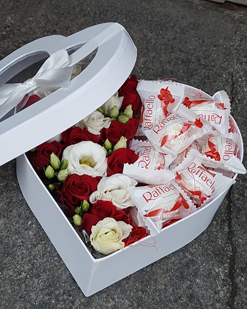 Ziedi un Raffaello konfektes sirds formas kastītē