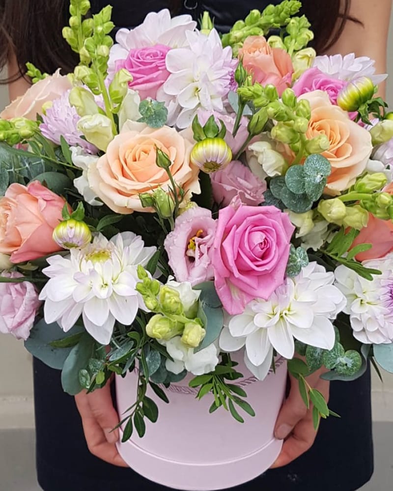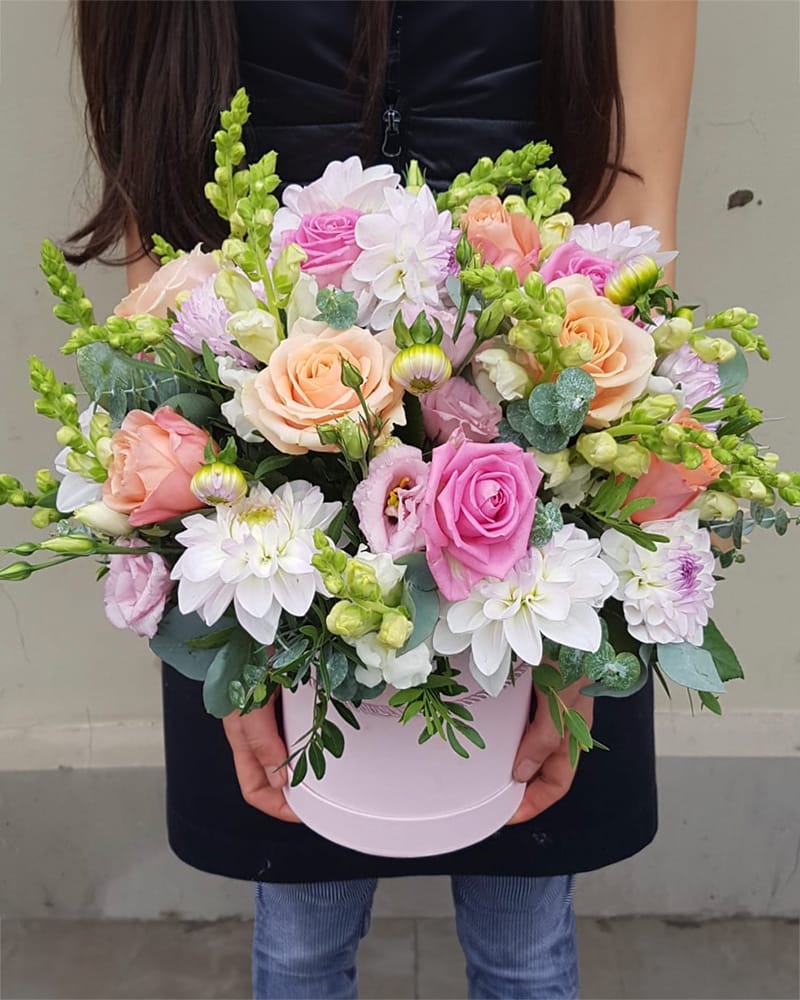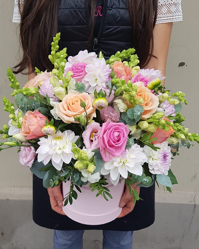 Ziedu kastīte ar dālijām, rozēm un citiem sezonas ziediem