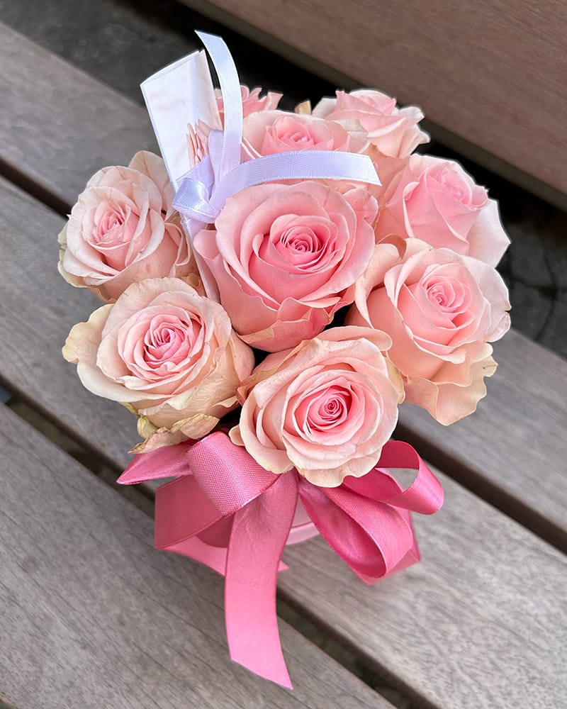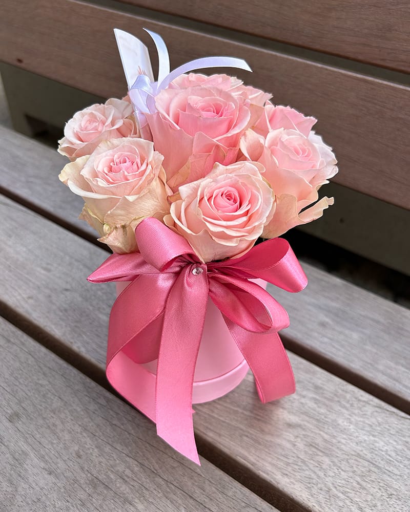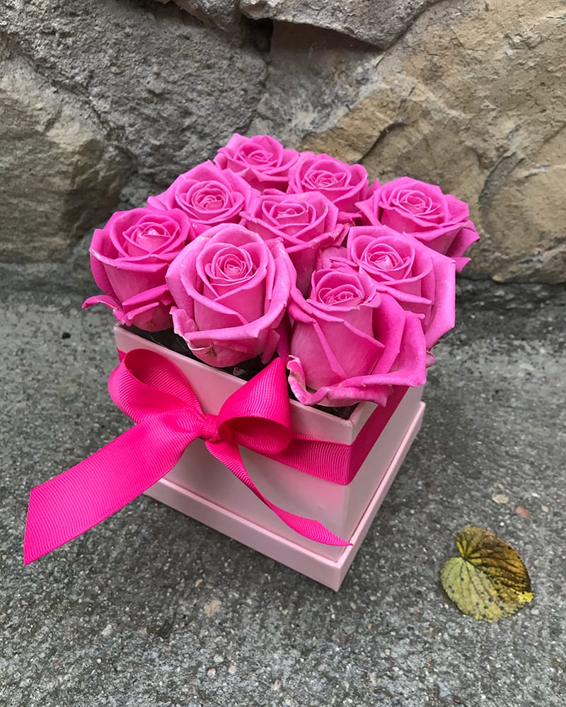 Rozā ziedu kastīte ar rozā rozēm, kastītē 9 rozes oāzē.