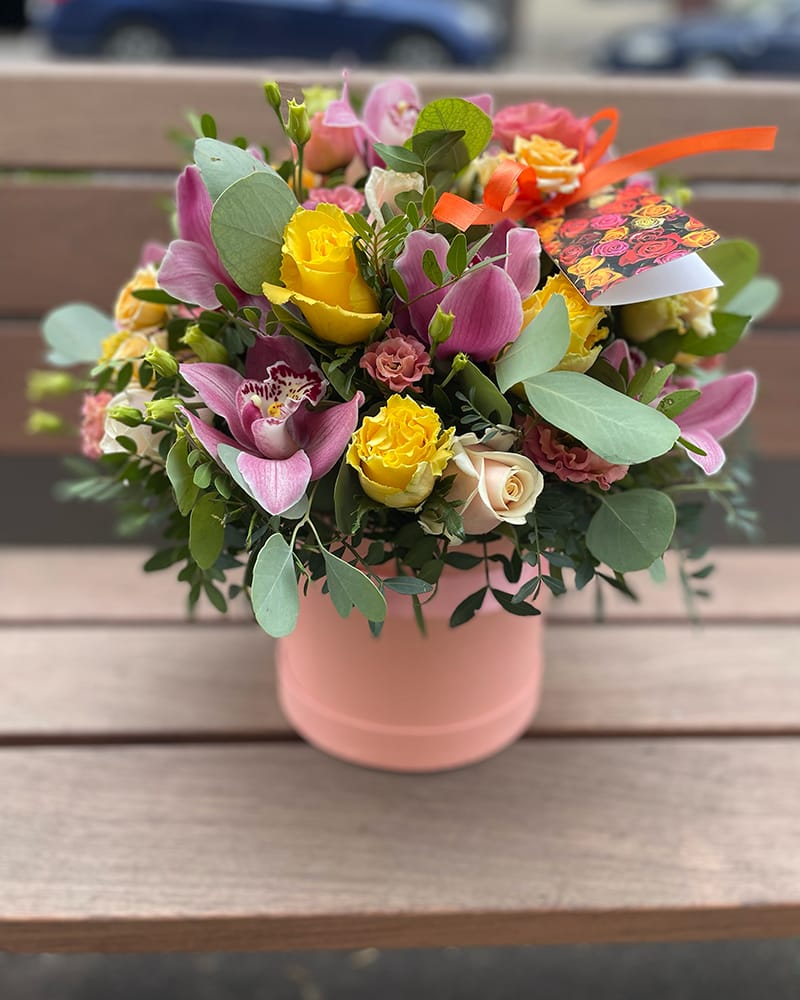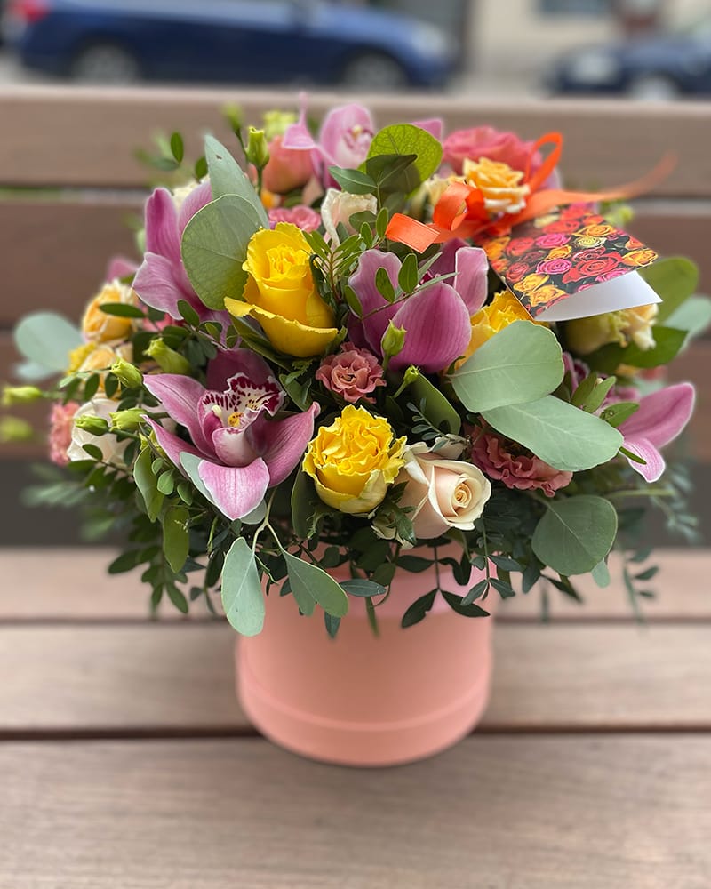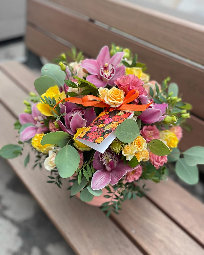 Ziedu kastīte sastāv no 3 krūmrozēm, 2 lizantēm, 5 orhideju ziediem, 5 rozēm, 0,5 eikalipts, ziedu kastīte, oāze, bezmaksas apsveikuma kartīte