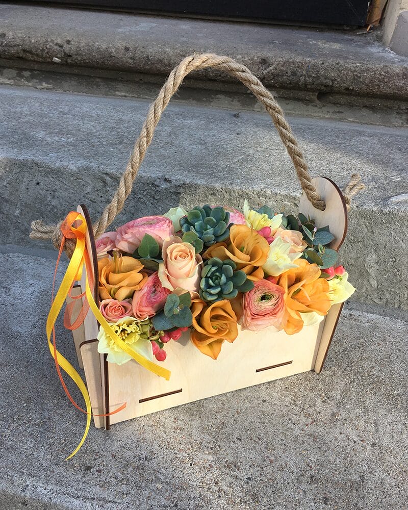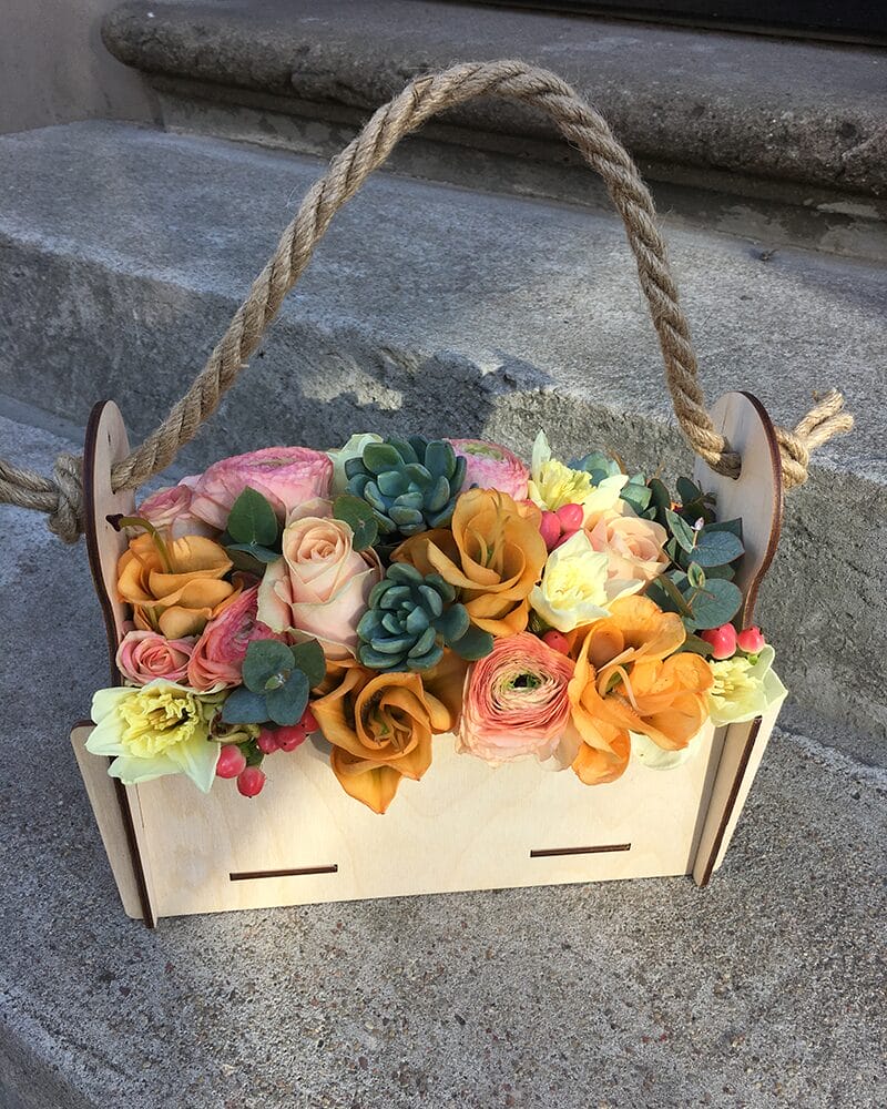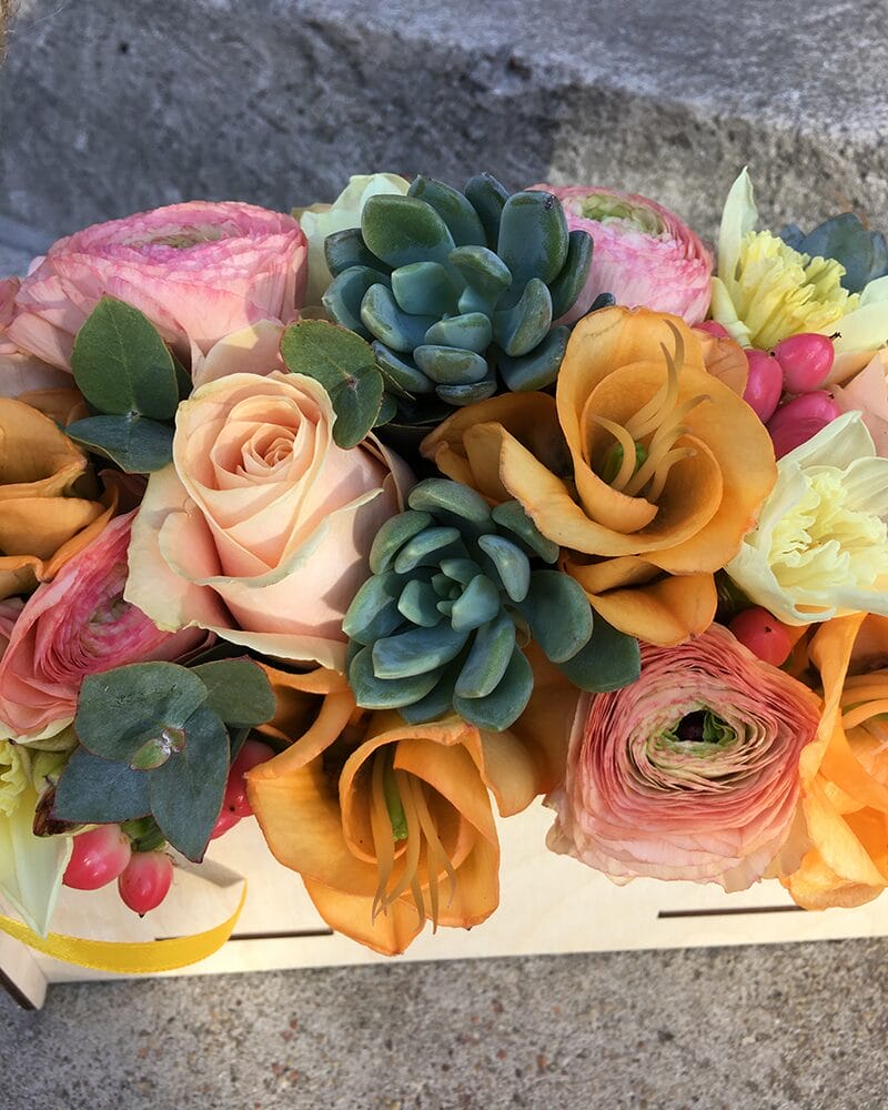 Ziedu kompozīcija koka kastītē. Kompozīcijā iekļautas rozes, ranunkuļi, alstromērijas un narcises, sukulenti un eikalipta zariņi.