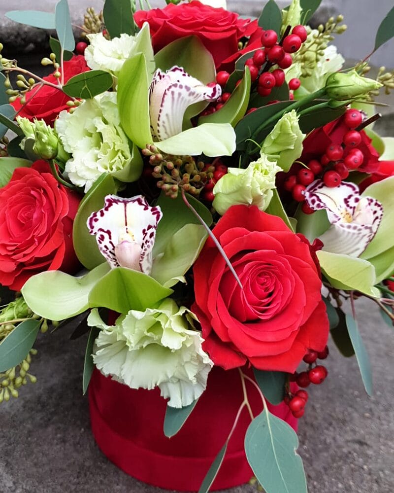 Dažadu ziedu kopozīcija sarkanā samta kastē. Ziedu kopozīcijas sastāvā rozes, cimbīdija (orjideja), lizantes un dekoratīvās odziņas.