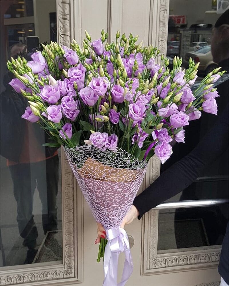 Violetu lizanšu pušķis dekoratīvā iepakojumā. Ziedu skaits pušķi ir maināms, sākot no 15 lizantēm.