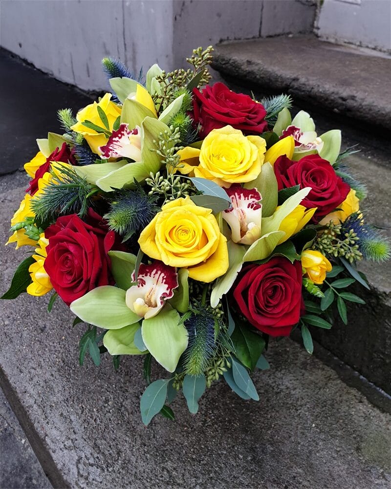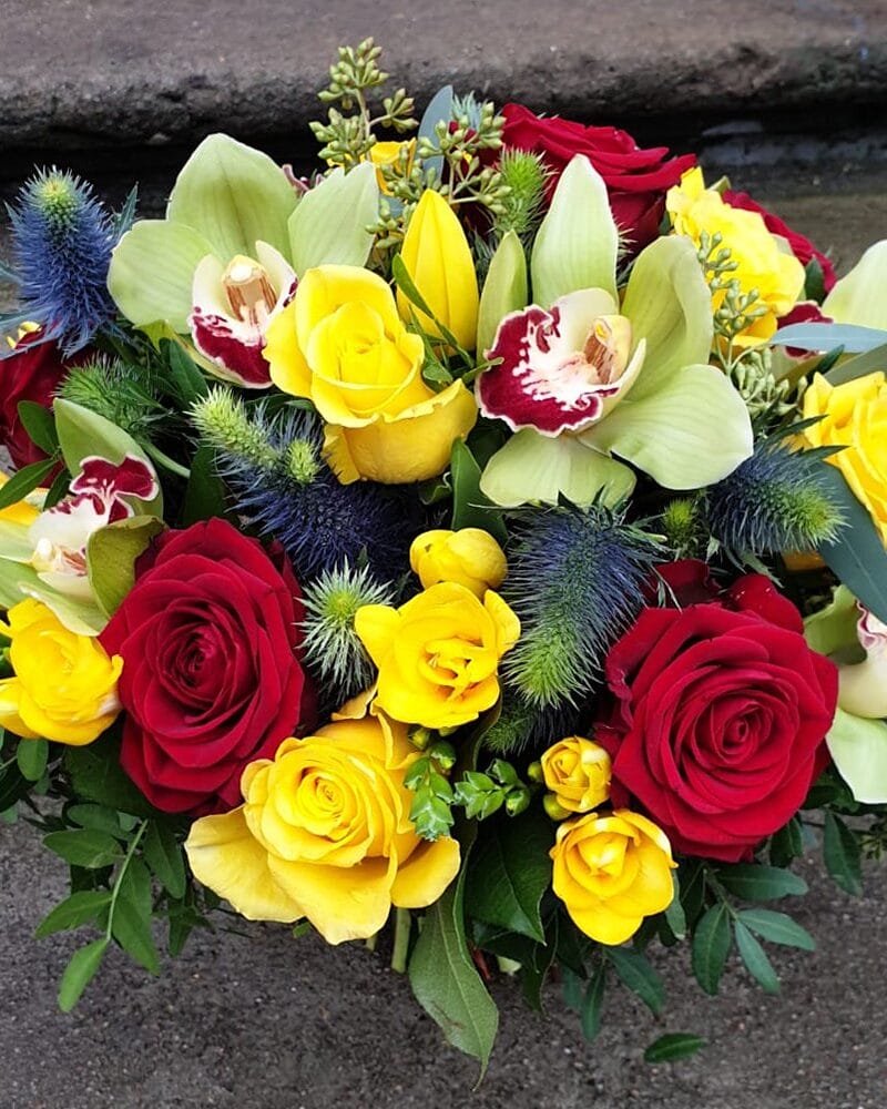 Krāsains dzeltenu un sarkanu rožu pušķis ar cimbīdijām, eikaliptu un dekoratīvjiem augiem.