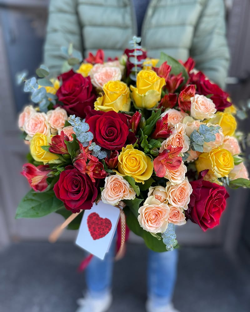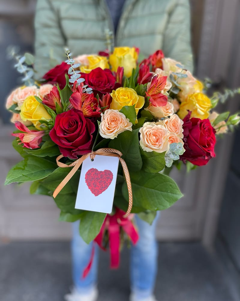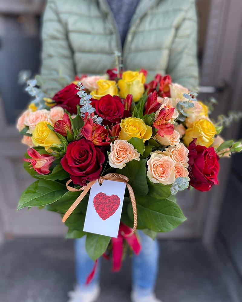 Ziedu pušķis Saulainais sveiciens. Krāšņa ziedu kompozīcija, pušķis veidots no dzeltenām un sarkanām rozēm, oranžām krūmrozēm un dažādiem zaļumiem.