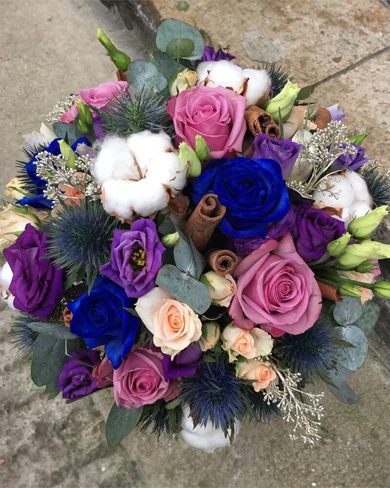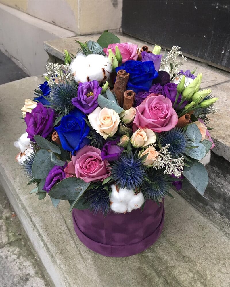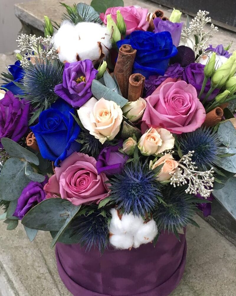 Ziedu kompozicija samta kastē ar rozēm, lizantēm, kokvilnu, kanēļa standziņām un eikaliptu.